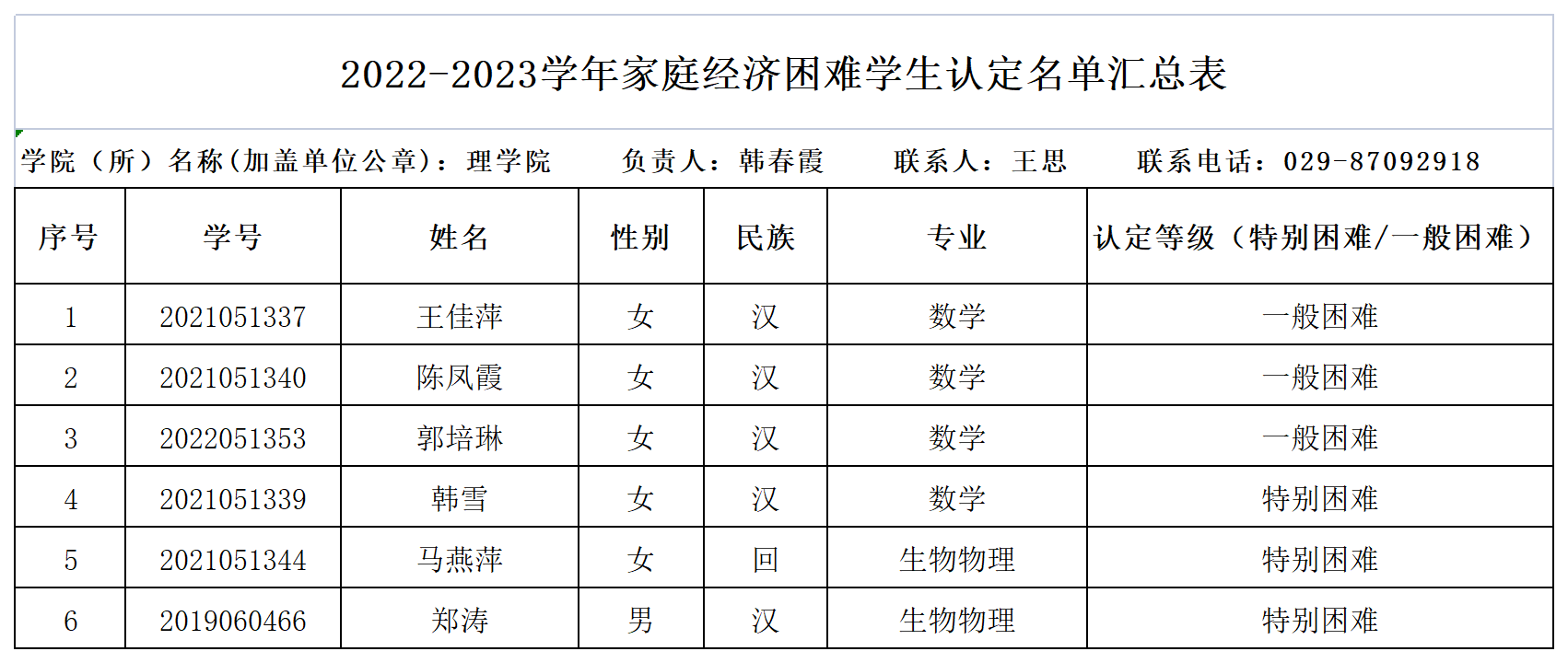 经本人申请、班级资助评议小组讨论、班级民主评议、院系初审,现将理学院2022-2023学年家庭经济困难研究生认定结果予以公示,详见附件名单。