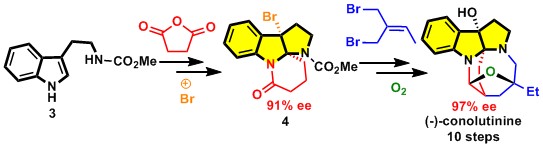 最近,谢卫青课题组在吡咯并吲哚生物碱的合成中再次取得重要进展,首次完成了吲哚生物碱(−)-Conolutinine的不对称合成。(−)-Conolutinine是从马来西亚房伞狗牙花中分离得到的一个萜类吲哚生物碱。该生物碱具有能够抑制KB细胞对长春新碱的耐药性活性。谢卫青课题组以简单易得的保护色胺3为原料,通过几步衍生化,以色胺不对称溴环化为关键反应,得到光学活性溴代吡咯并吲哚啉中间体4 (图2)。接下来经过构建氮杂八元环、氧化双键、还原形成四氢呋喃环最终完成了(-)-conolutinine的不对称合成。整个合成路线仅用了十步,最后用单晶衍射确定了天然产物的绝对构型。本研究工作在线发表在Organic Letter上(Org. Lett. 2015, DOI: 10.1021/acs.orglett.5b02046,IF = 6.346)。链接: