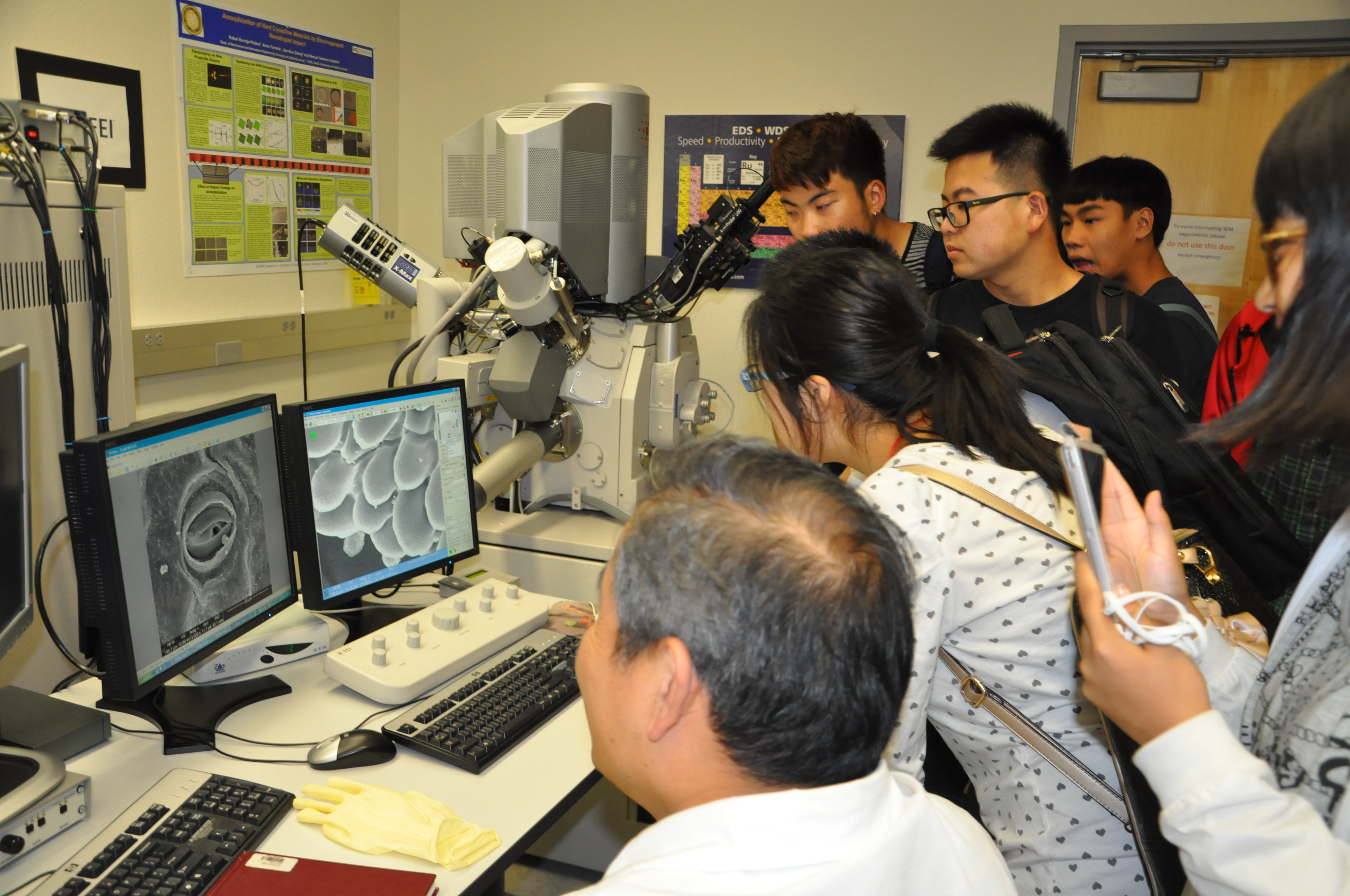 当学生看到化学与结构生物学实验室里一台台结构复杂、体型庞大的质谱仪等实验仪器时,惊叹之声不绝于耳。教授自豪地向同学们介绍说,“这几台实验仪器是我的研究生付出了8年心血制造的,目前运转良好,能满足学生的实验需求,所测数据准确可靠。”生命学院13级生物技术专业学生黄旭成同学感慨道,“UCI的学生真幸福,学校和导师能真正放手让学生自己去做一些事情,也正是因为这种大胆创新的教学方式,才成就了UCI今天的辉煌。”在材料工程与信息技术实验室里,郑建国教授向同学们耐心地展示了利用仪器观察叶片、昆虫腿和翅膀表面结构的方法。尤其是看到被放大了几十万倍后昆虫腿表面的绒毛结构和翅膀表面漂亮的花纹图时,大家惊叹于微观世界的奇妙。他说,得到好的实验结果没有你们想象的那么难,也不可能太容易。只要同学们努力去做,总能把它做好。在计算机科学实验室里,在读研究生分别向同学们展示了他们自己制造的3种机器人的特殊功能。