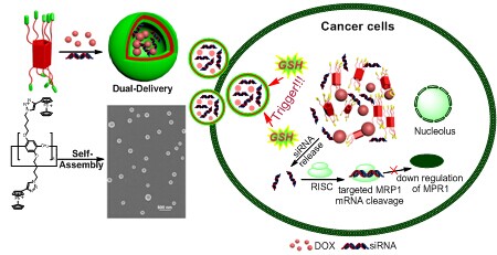 在癌症治疗中,药物对正常细胞的副作用和癌细胞不断产生的耐药性一直是化疗面临的两大难题。导致癌症化疗失败的一个重要原因就是癌细胞产生多药耐药性。纳米药物载体是一种纳米级微观范畴的亚微粒药物载体,以其微尺寸效应和可智能化,为解决这些难题提供了一个新的有效途径。该研究在国际上首次运用新型大环主体分子柱芳烃和二茂铁,设计合成了一种全新的智能纳米药物载体。与普通的药物载体相比,此载体具有两大特点:(1)氧化还原响应性。由于癌细胞中谷胱甘肽(GSH)的浓度比正常细胞高10倍以上,通过GSH对氧化态二茂铁的还原作用能够实现抗癌药物在癌细胞中的快速智能释放,以减少化疗对正常细胞的副作用;(2)阳离子特性。氧化态二茂铁具有正电性,此特性使这一载体成功实现了对抗癌药物和带负电荷的siRNA的双负载,siRNA进入癌细胞后能够沉默相关的抗性基因,从而降低癌细胞的耐药性。总之,这一双负载体系极大地提高了抗癌药物对癌细胞的选择性杀伤力,增强了癌症化学治疗的效果,并已经在细胞实验中得到了充分验证,对癌症的化学治疗具有十分重要的意义。