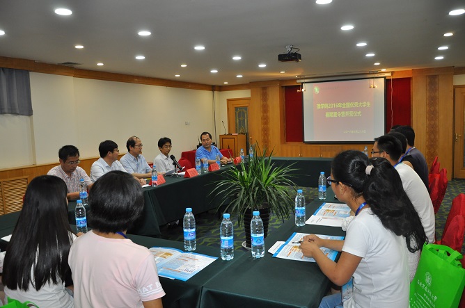 26日下午,学院首届“全国优秀大学生暑期夏令营”开营仪式在新天地酒店顺利举行。院长高锦明教授、研究生院招生处申让平处长、副院长张社奇教授、副院长王俊儒教授、段金友教授以及10名优秀大学生参加了开营仪式。高锦明对营员们的到来表示热烈欢迎,并向全体营员介绍了理学院基本概况和学科专业方向;研究生院招生处申让平处长介绍了我校研究生招生的基本情况和招生政策;营员王宁同学发言感谢理学院各位老师、志愿者的辛苦付出,表示一定珍惜本次机会,与老师、同学进行深入交流。开营仪式后,哈佛大学医学院毕业的段金友教授为营员做了《多糖及其缀合物的结构与功能》的学术报告,段老师深入浅出地讲解引发了同学们深入思考。